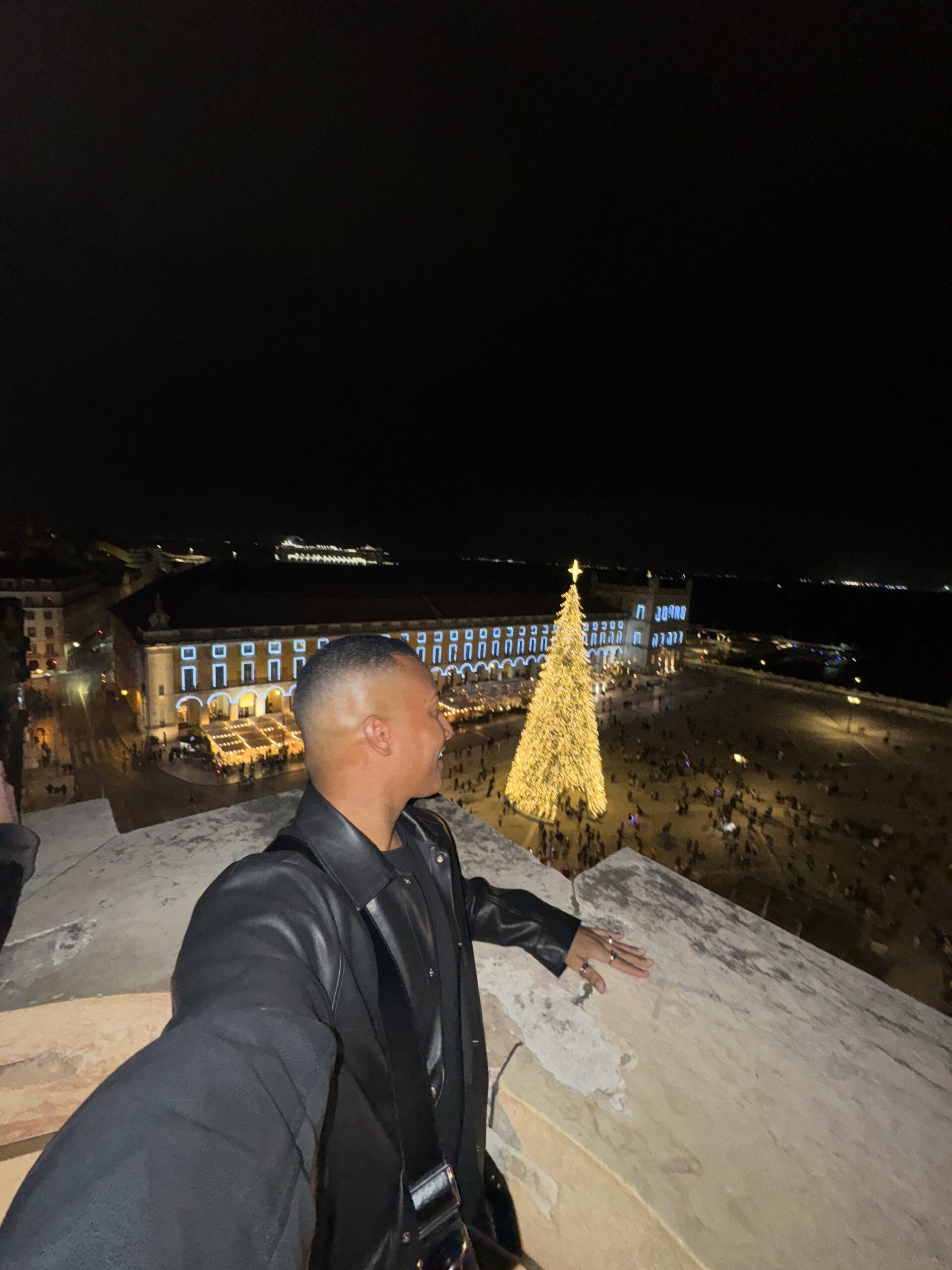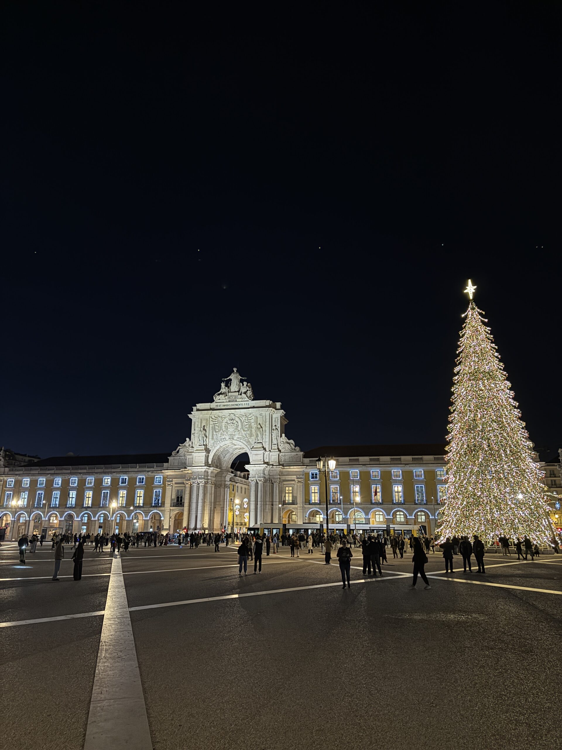 🏙️ Praça do Comércio – cenário mágico junto ao Tejo, com árvore gigante e mercado de Natal.